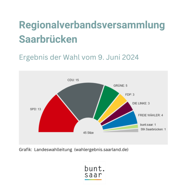 bunt.saar ist zum ersten Mal bei der Kommunalwahl angetreten. In der Regionalversammlung konnten wir mit 2,6 % einen Sitz erlangen und im Stadtrat mit 3,4 % der Stimmen zwei Sitze.